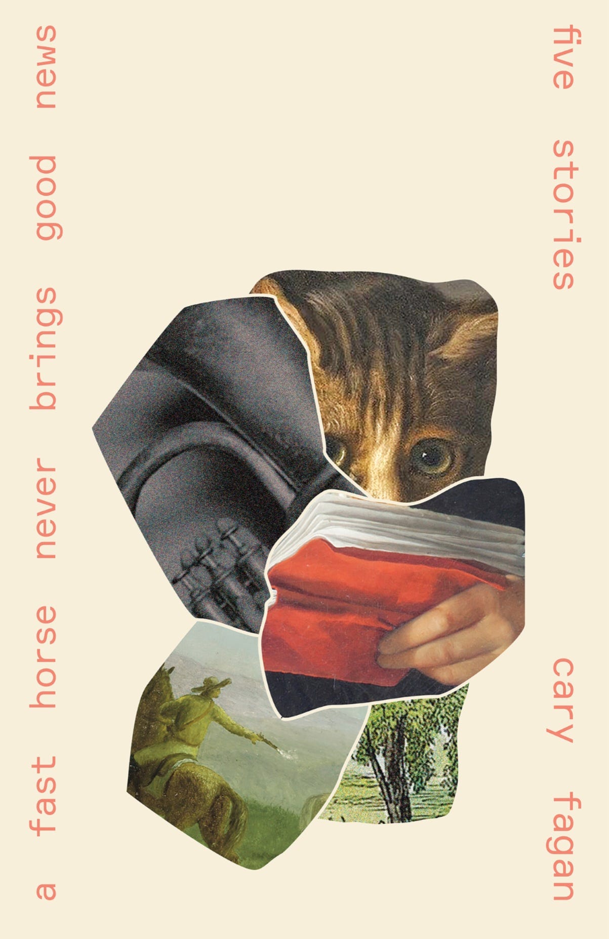 The collage on the book’s cover kaleidoscopes five overlapping images, each corresponding to a story. Animal eyes peek at the pages of a book held by fingers that reach toward a euphonium and a family tree, while a cowboy shoots the breeze, backfires, and delivers all the news that fits to print in the funhouse of fiction.