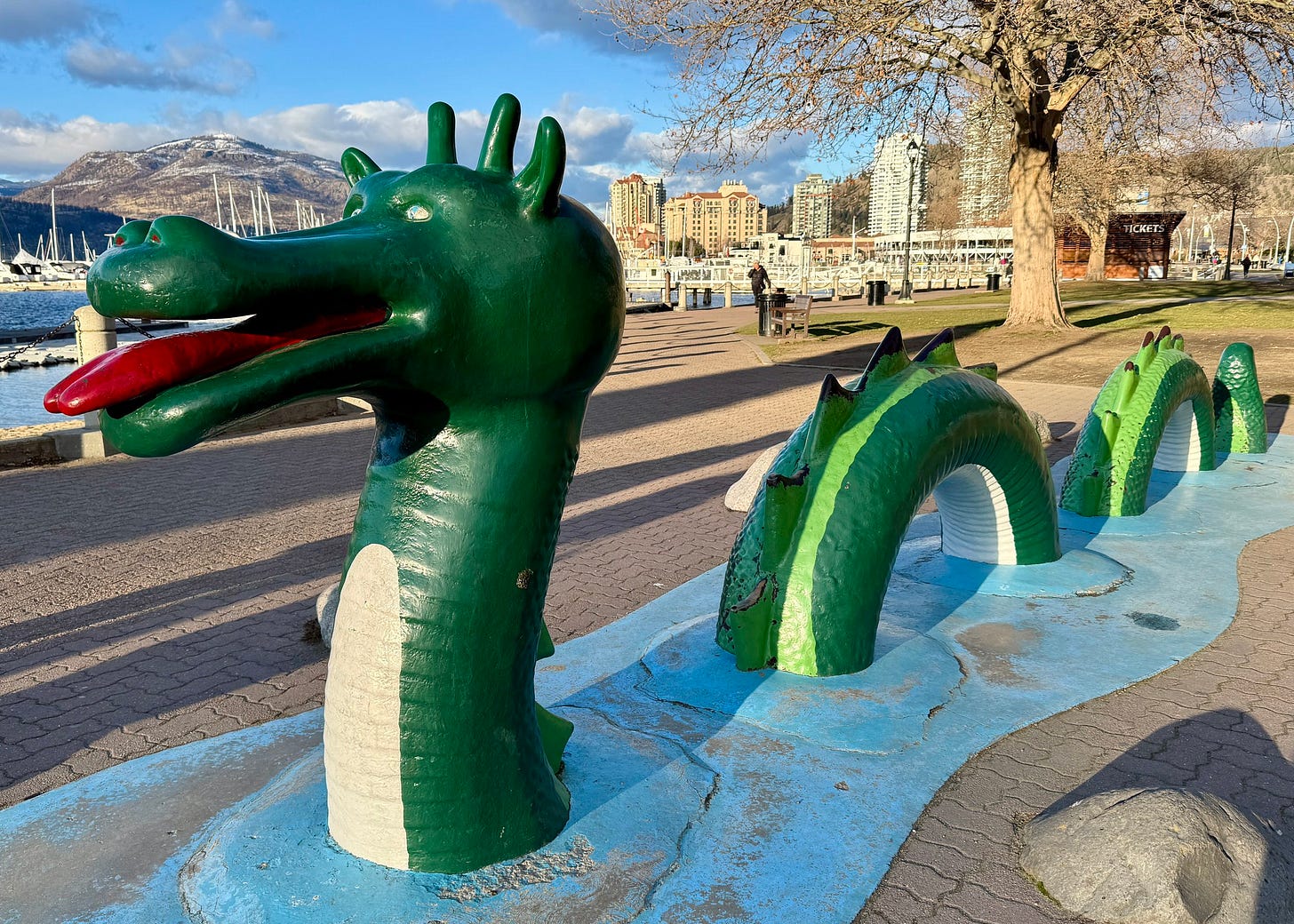 You can almost hear Bill’s rueful sigh as, in Kelowna, he beholds Peter Soelin’s 1960 sculpture of Ogopogo, its serpent-like body “undulating like whitecaps, scales and stegosaur fins, with a head like a giraffe, topped with two knobby protrusions… A cream-coloured belly, green sides, a brown razorback top. And an open-mouthed smile, red tongue lolling, as though blowing a raspberry.” A sculpture, in other words, that’s more cartoon than art.