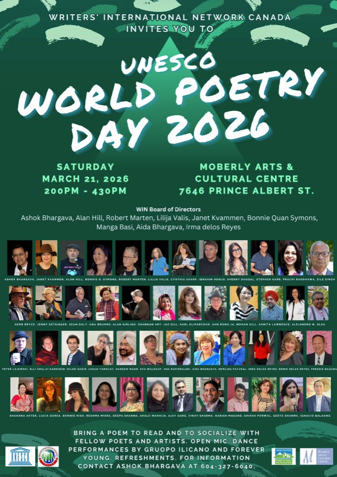 When I was named the Writers International Network (WIN) Poet Laureate, I had the pleasure of speaking with WIN founder and president Ashok K. Bhargava about his goals and inspiration for WIN Canada. It was an immense pleasure to converse about WIN’s annual UNESCO (United Nations Educational, Scientific and Cultural Organization) event and monthly activities hosted in Vancouver.