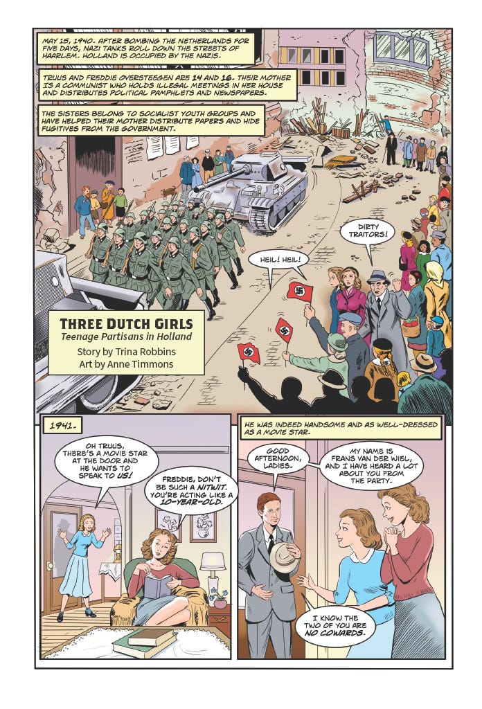 In “Three Dutch Girls: Teenage Partisans in Holland,” story by Trina Robins, art by Anne Timmons, gentle colours depict the three girls and their surroundings—which makes the eventual horrors they endure even more shocking.