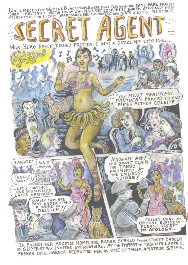 Mais non, non, Schutzstaffel! As beautifully portrayed by writer/illustrator Sharon Rudahl in “Secret Agent,” a chapter in the comic book Partisans: A Graphic History of Anti-Fascist Resistance, the Missouri-born Baker is a resourceful spy. She takes notes on the officers’ cocktail chatter, then passes the info along to the Allies—vital in helping them plan their 1942 invasion of North Africa.