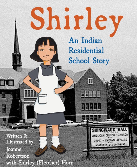 You’ve just met the protagonist of Shirley: An Indian Residential School Story. As with its cover, described above, Joanne Robertson’s illustrated biography of young Shirley (Fletcher) Horn is both disturbing and inspiring.