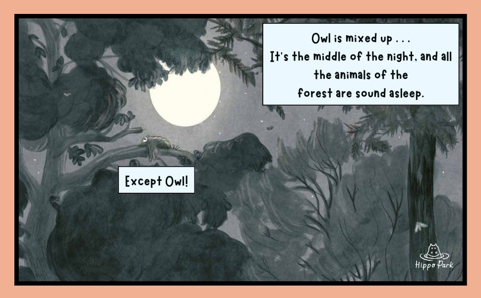 The story begins at night. Is Owl ever in a flap! Unable to sleep, his eyes bright and round as the hovering moon, he can’t understand why no one else is awake. Well, “Owl was going to find out.”