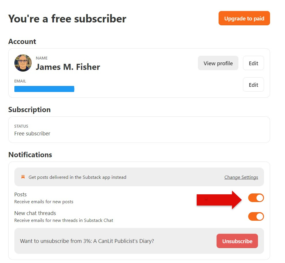 To stop getting our emails without unsubscribing, log into your Substack profile, look for the Substacks you are subscribed to, and slide the toggle button to the left. See the big red arrow below. You will remain subscribed to the site, but will not receive any emails from us.