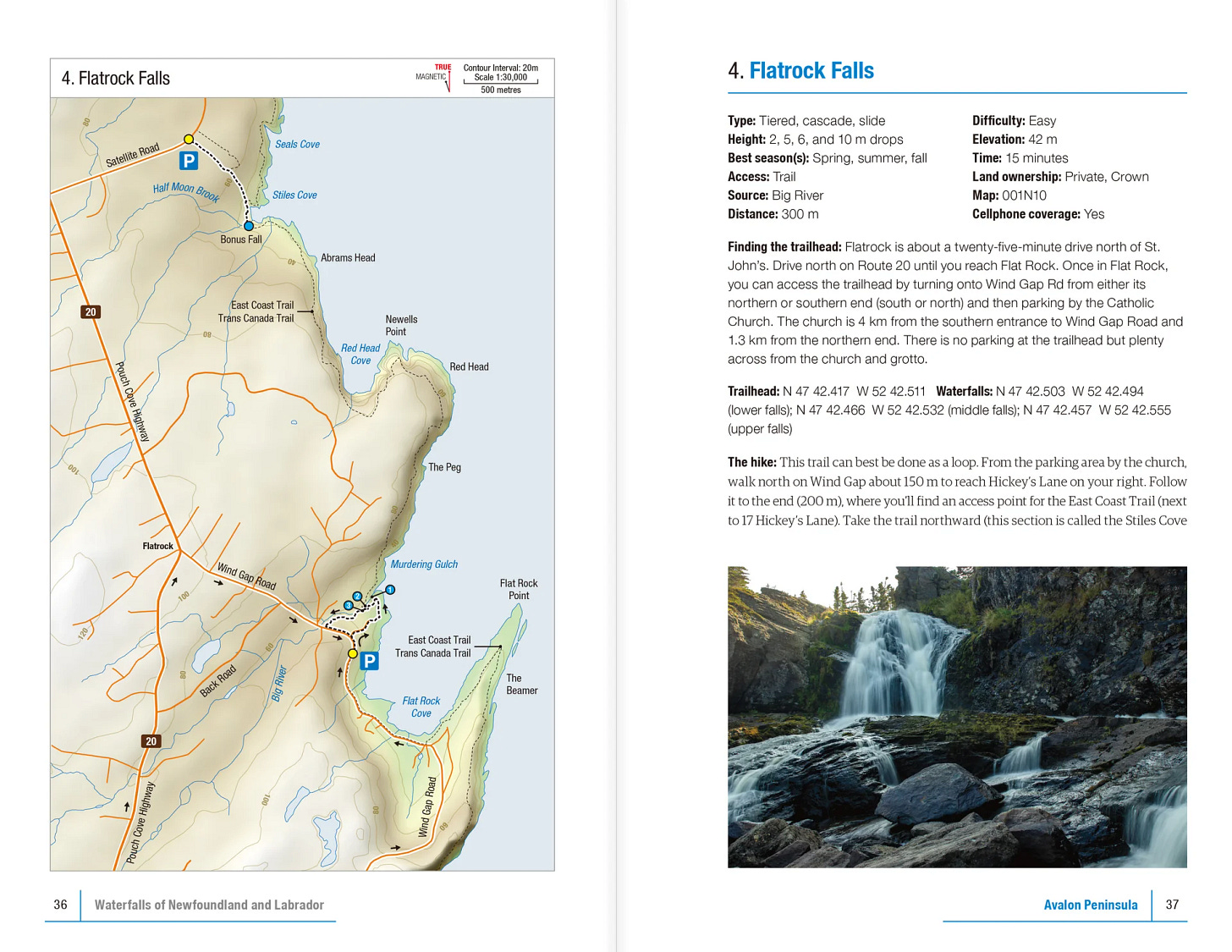 The varied and complex geography in Waterfalls of Newfoundland and Labrador is divided into six easy-to-read geographic areas: Avalon Peninsula, Burin and Bonavista Peninsulas, Central Newfoundland, Western Newfoundland, Great Northern Peninsula, and Labrador to bring you hundred stunning waterfalls.